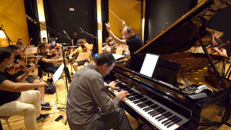 Pianist Sergei Kvitko, conductor Tigran Shiganyan, and the Madrid Soloists Chamber Orchestra in recording session. (credit: Jorge Nunez)