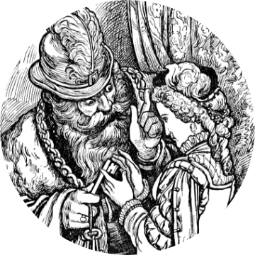 Bluebeard gives his wife the keys to his castle in this woodcut by Gustave Doré for Les Contes de Perrault (Paris, Jules Hetzel, 1862)